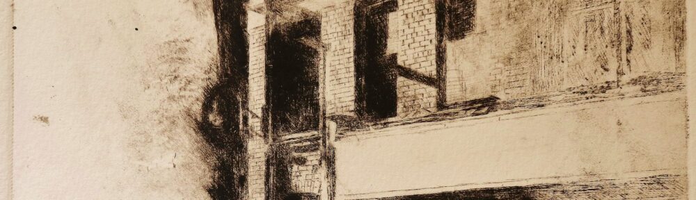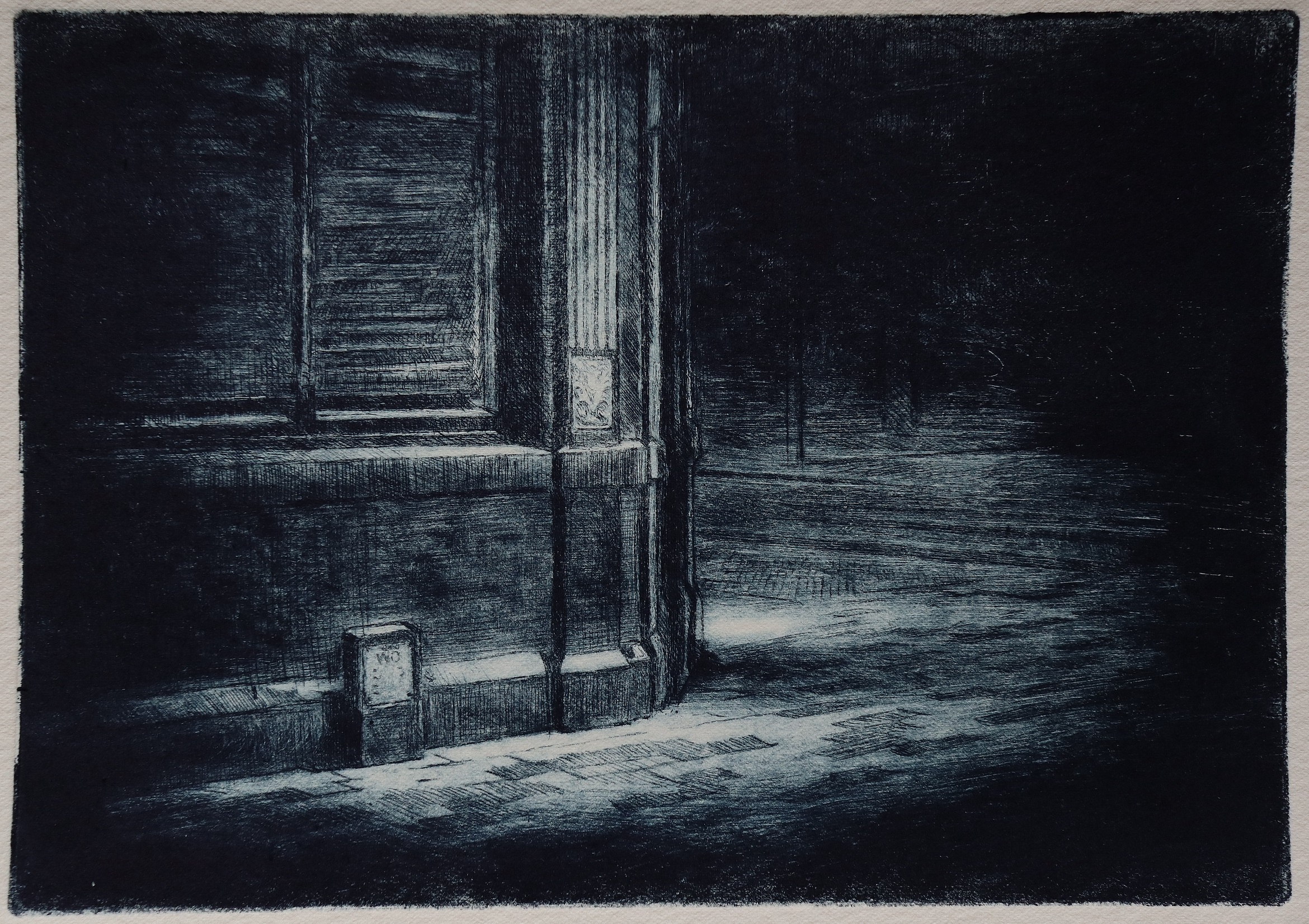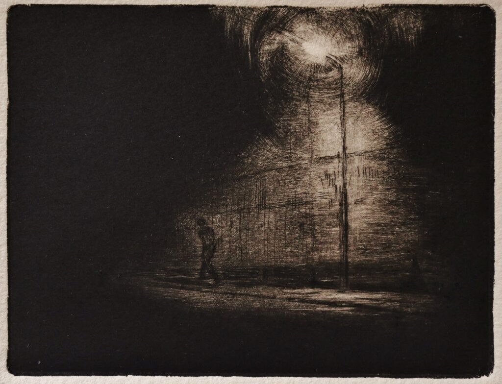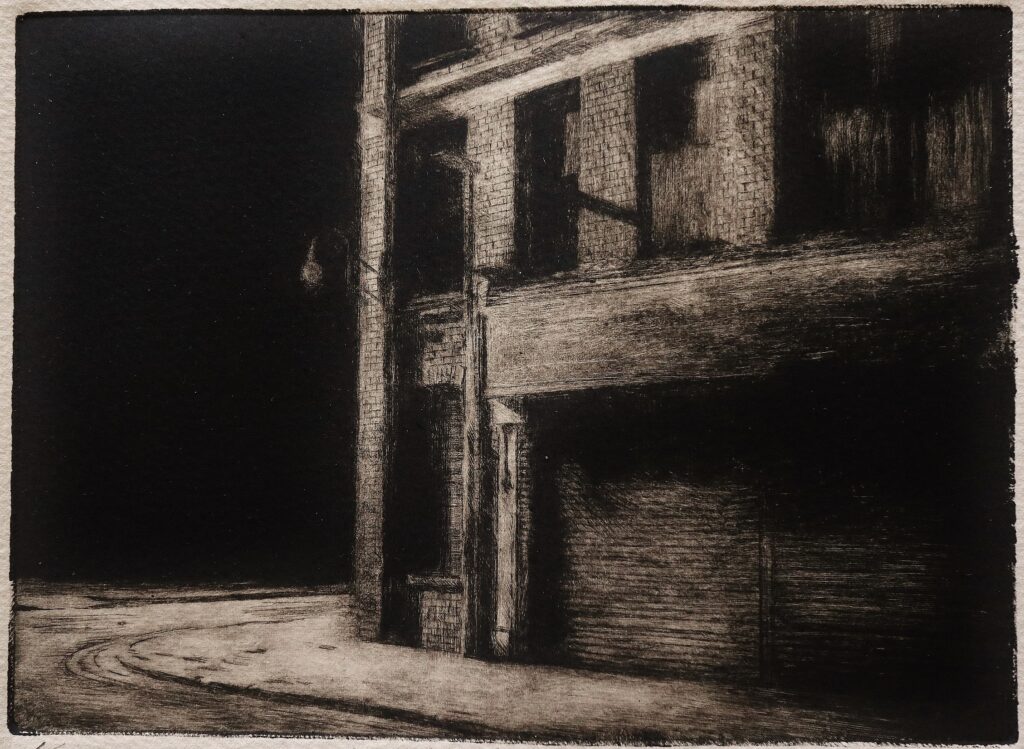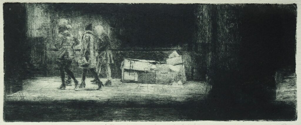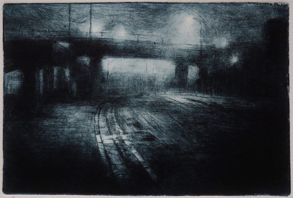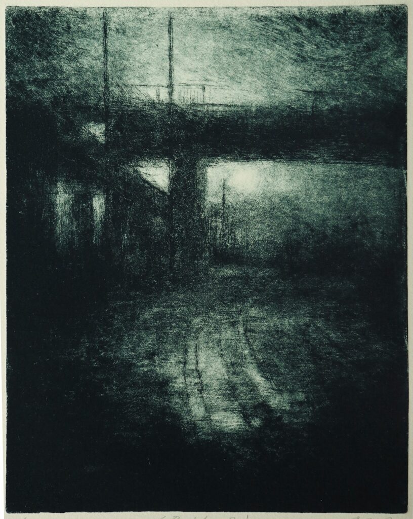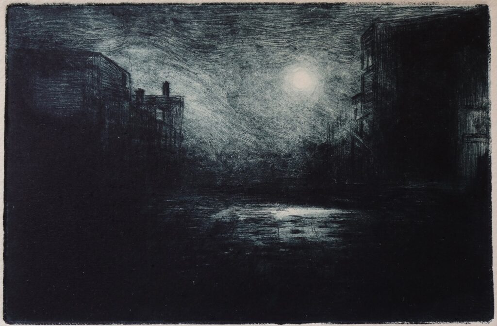 Sourced mainly from Grimsby and London, most of the basic ideas for ‘Night Etchings’ were formed over a winter period. The etching plates, made a few months later, allowed time for each idea to filter through layers of memory and imagination, eventually finding expression through the fluid application of the printmaking process.