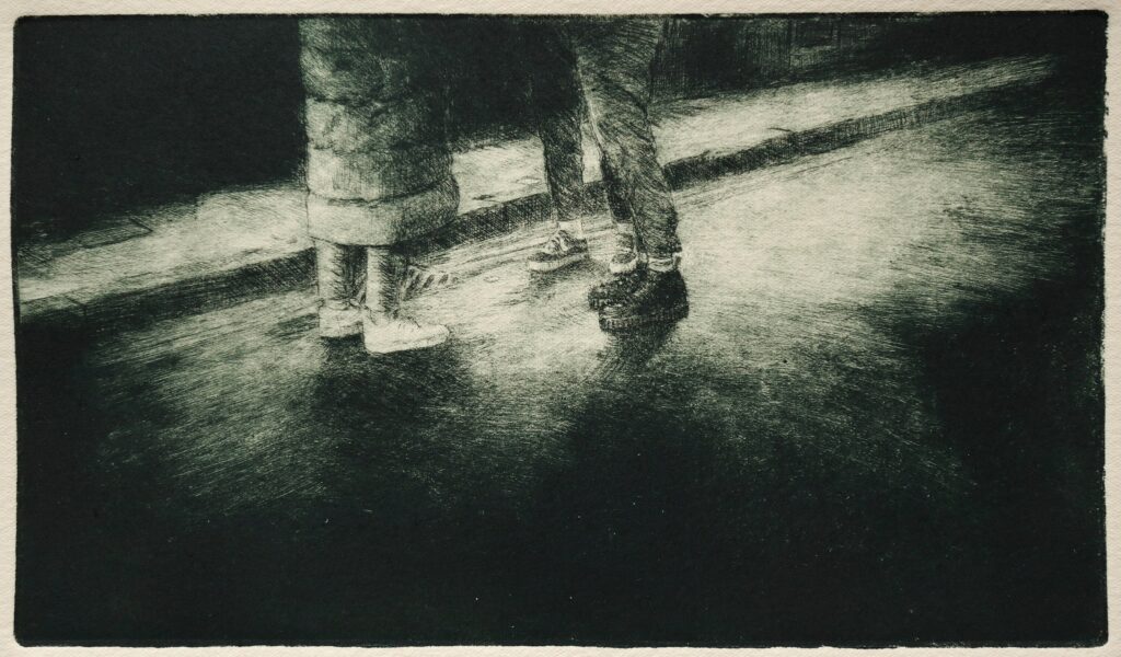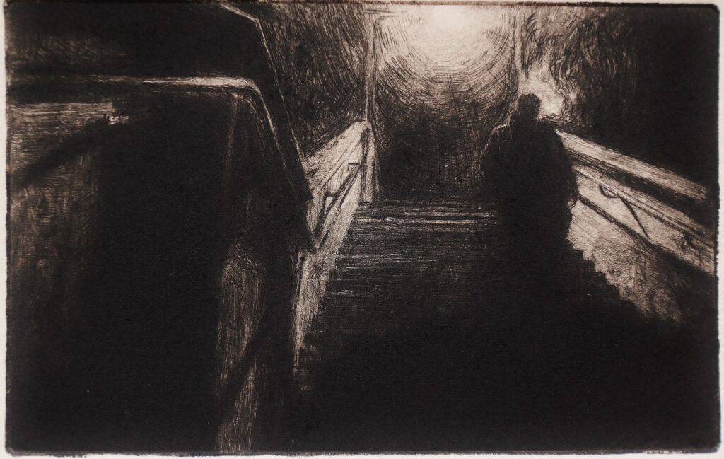 https://ontopdownunderreviews.com/about-kazza/ Steps – 10pm 1/1 2023 Drypoint 8x12cm. £250